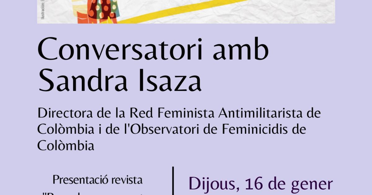Enviat per gestora el dc., 15/01/2020 - 14:55 El proper 16 de gener a les 18:30h a Ca la Dona (carrer Ripoll, 25 BCN), ens trobarem amb Sandra Isaza, de la Red Feminista Antimilitarista i de l'Observatori de Feminicidis de Colòmbia. Acte d'accés lliure. Comparteixo