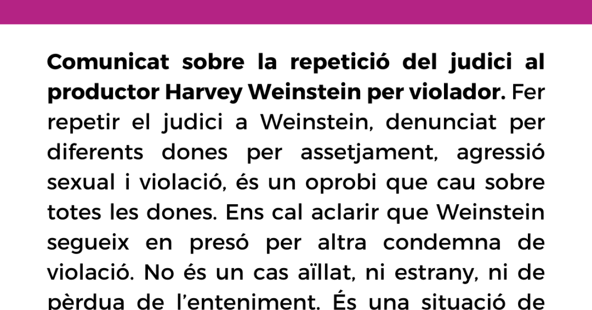 Fer repetir el judici al productor Weinstein, denunciat per diferents dones per assetjament, agressió sexual i violació, és un oprobi que cau sobre totes les dones. Ens cal aclarir que Weinstein segueix en presó per altra condemna de violació.