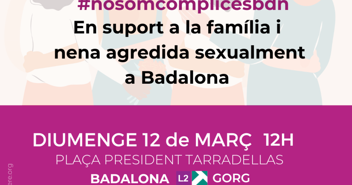 Aquest diumenge 12 de març, a les 12:00h la Federació de Dones de Badalona, amb el suport de la Plataforma Unitària contra les violències de gènere ha convocat una concentració a Plaça Josep Tarradelles de Badalona per rebutjar i condemnar la violació grupal d'una menor d'11 anys, produida aquesta setmana a Badalona.