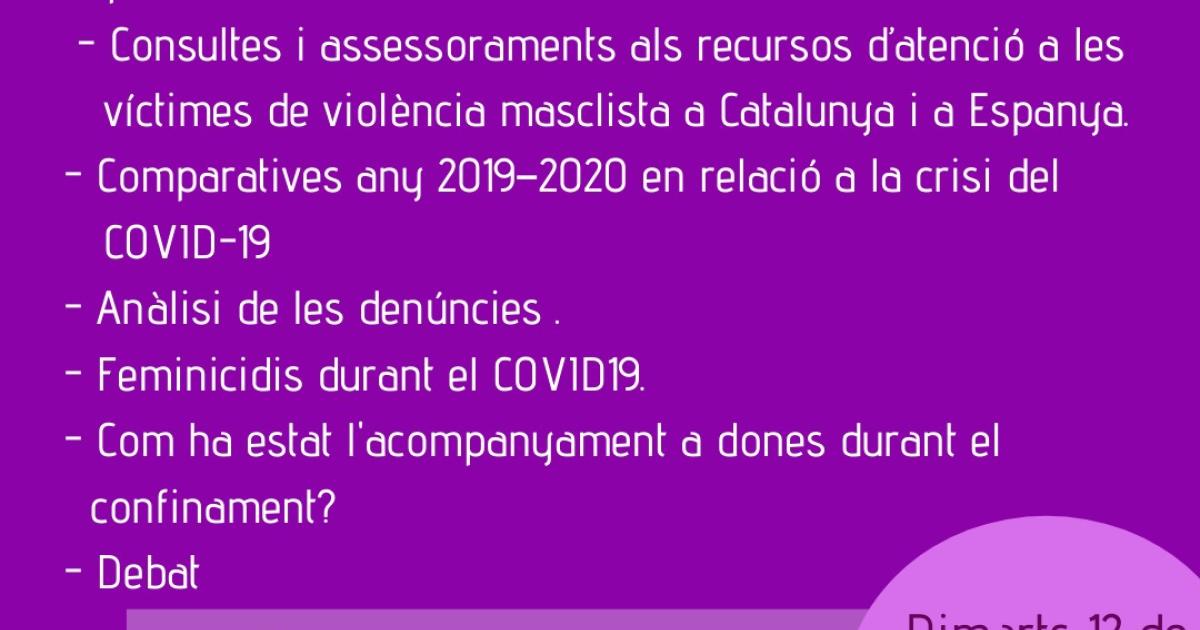 El passat dimarts 12 de maig, la Plataforma Unitària Contra les Violències de Gènere, va realitzar el primer webinar en relació a la crisi del COVID-19 i les violències masclistes a Catalunya i Espanya, evidenciant que en un context de confinament les violències envers les dones empitjoren invariablament. Primerament les voluntàries Sara García Arias (criminòloga) i Natalia Tamara Rosa (sociòloga) de la Plataforma van exposar dades i estadístiques, així com una breu explicació de les possibles causes. A continuació les entitats Dones amb Empenta, Hèlia Dones, Mujeres Pa’lante i Ca l’Aurèlia van oferir-nos la visió i experiència de l’acompanyament a les víctimes durant el confinament.